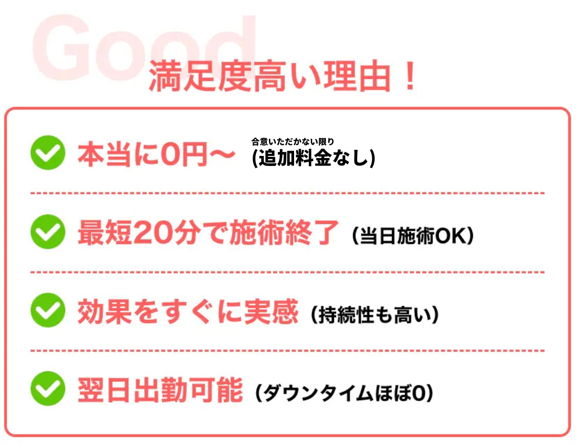 美容系の施術は勧誘が怖くて避けていましたが、ここは無理な勧誘一切なし!追加料金もなく、評判がいいのも納得。リフトアップ効果もすぐに感じられ、ダウンタイムも短く、翌日も普段通り仕事に行けました。※これは当院からの依頼に基づくコメント